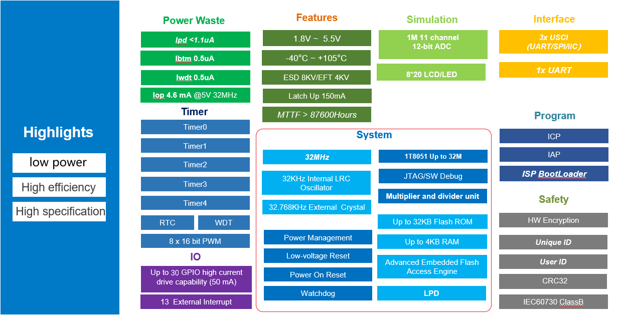 SC92L series general purpose MCU also integrates super-rich hardware resources: 16-64 Kbytes Flash ROM, up to 4 Kbytes SRAM, 0-4 Kbytes LDROM, 1 Kbytes EEPROM and supported BootLoader; up to 46 GP I/Os, multiple externally interruptible IOs, 5 16-bit timers, up to 17-channel 12-bit high-precision ADC, built-in 2.4/1.024/2.048V ADC reference voltage, multi-channel complementary PWM with deal-time insertion, multiplier and divider, CRC check module, built-in LCD/LED driver; internal high-precision high-frequency 32MHz oscillator, /1 /2 /4 /8 frequency division of high frequency clock for system clock, internal ±4% precision low-frequency 32kHz oscillator, externally connected 32.768kHz crystal oscillator and 8 levels of LPD, UART, SPI, TWI and other communication interfaces.