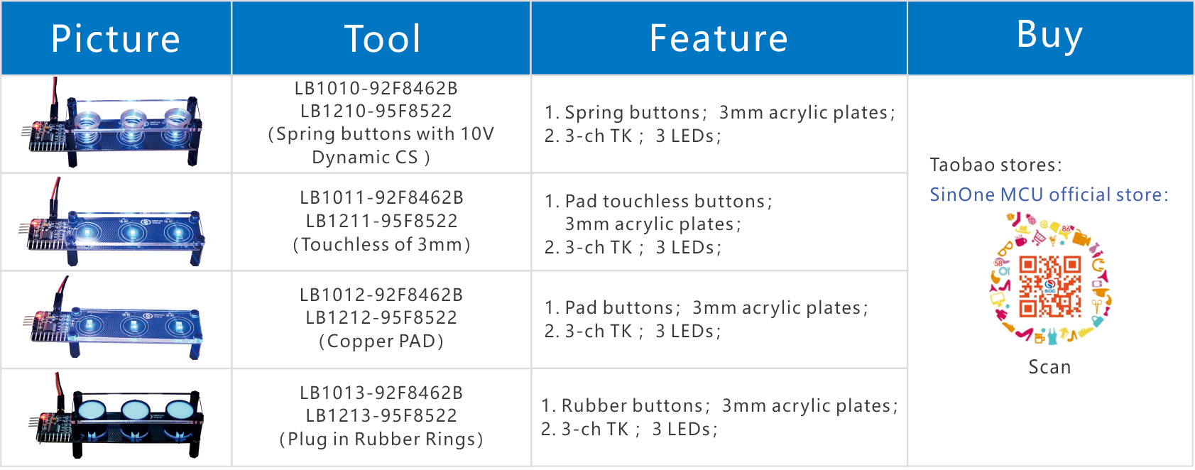 SinOne LB101X series evaluation board supports different types of touchkeys. LB101X takes SC92F8462B as the master. Touchkey IC SC92F8462B is a double-module capacitive touchkey chip with industry-grade specifications, featuring 4KV EFT and 6KV ESD contact capability, which is the first choice for electronic touchkey solution. Based on the extension and modification of LB101X, the button scheme can be designed for touchkey-related household appliances and electronic products such as induction cooker, smoke exhaust, disinfection cabinet, etc.